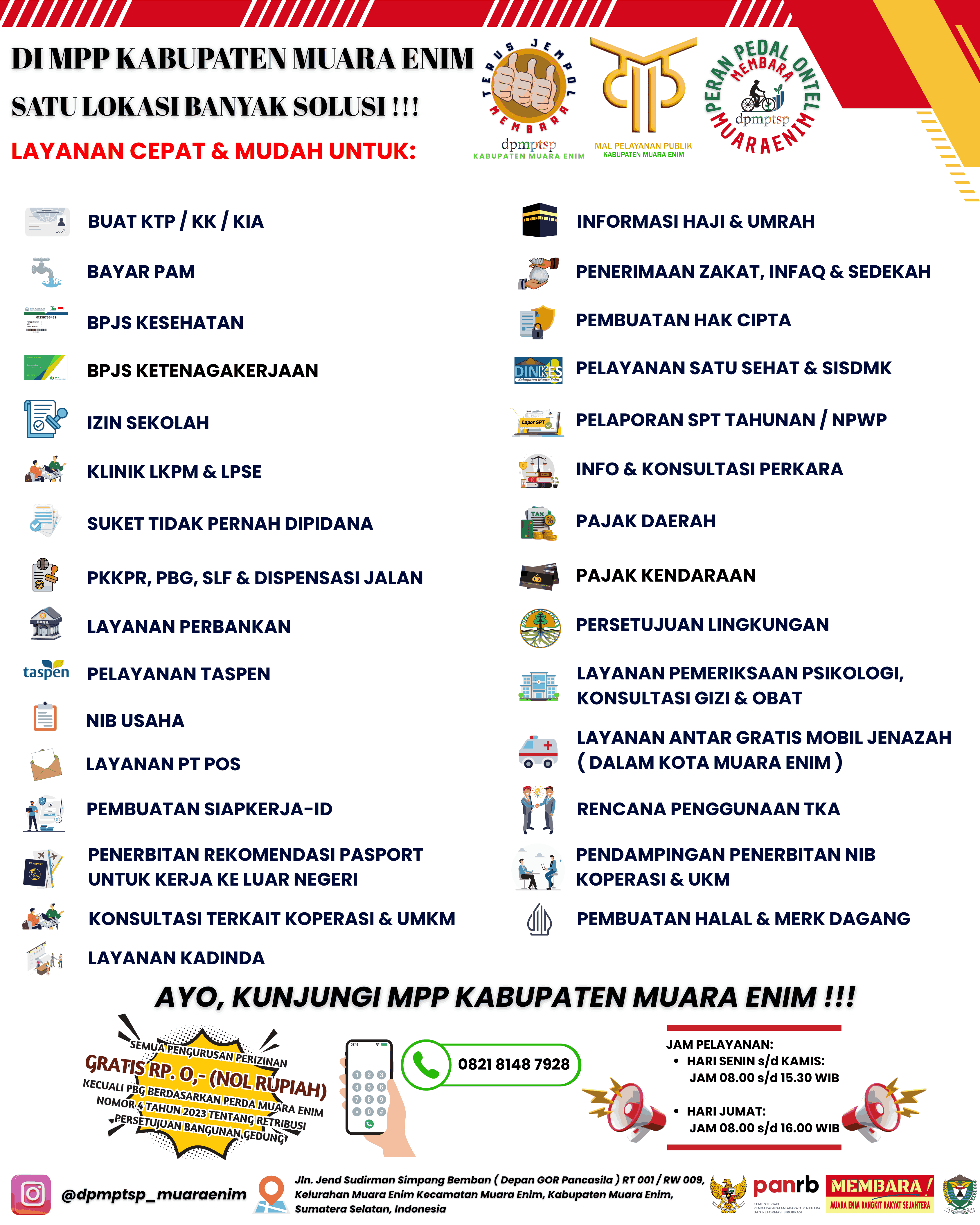 Seluruh Layanan yang ada di Mall Pelayanan Publik (MPP) DPMPTSP Muara Enim. Bayar PDAM, Listrik, BPJS, Pembuatan KTP, dll.